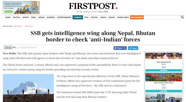 中印洞朗对峙已经和平结束20多天了,但印度好像忍不了边境的宁静,就在9月17日,印度要向与尼泊尔和不丹的边境地区“增派情报部队”,这支情报部队是印度内政部直属的“驻边境部队”(印度称之为“SSB”)。