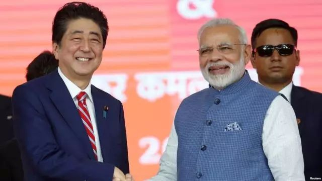 9月14日,日本首相安倍晋三与印度总理莫迪在艾哈迈德巴德的高铁动工仪式上握手。安倍此次访问印度,双方签订了多项合作协议,其中一些被认为是日印加强合作,共同抗衡中国之举,比如日本在印度东北部的投资。