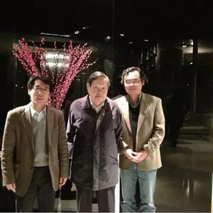 2013年,薛其坤研究组实验发现了量子反常霍尔效应。我认为没有杨先生就没有这项成果。一方面,杨先生把张首晟请到高等研究中心做客座教授,张首晟指引祁晓亮、刘朝星这些优秀的博士研究生进入到拓扑绝缘体领域,而祁晓亮和刘朝星及合作者则在国际上最早在理论上预言了实验观测量子反常霍尔效应的机理和实际的材料体系。另一方面,薛其坤2005年到清华工作,是杨先生等在关于清华物理系应重点发展实验凝聚态物理的指导方针下的产物。正是杨先生,为张首晟和薛其坤之间的合作提供了平台,导致薛其坤研究组实验上观测到了量子反常霍尔效应。杨先生听到这个好消息后,非常高兴,当即要请吃饭,评价为“这是个诺贝尔奖级的成果”。图1 是晚餐后杨先生、薛其坤、王亚愚三人的合影。王亚愚是薛其坤主要合作者之一,从事输运实验。这个例子反映了杨先生作为一位物理学大师和领导人的远见卓识。