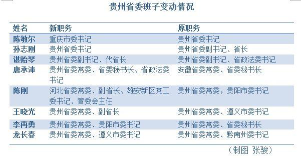 5个月过去,陈敏尔、陈刚调离贵州,唐承沛从安徽调入,另外,孙志刚、谌贻琴、王晓光、李再勇、龙长春也分别履新,职务变动人数达到整个班子的2/3。
