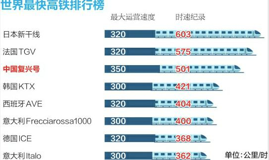 作为中国具有完全自主知识产权的动车组列车,“复兴号”以时速350公里“开跑”,标志着中国成为世界上高铁商业运营速度最高的国家。全球出行网站GoEuro的统计数据显示,日本新干线与法国TGV的最高时速均为320公里,此前同为世界运行最快的高铁,而“复兴号”350公里/小时的运行速度,击败了法国TGV和日本新干线。但在创下的时速纪录方面,后者确实以惊人的603公里/小时的速度保持了世界纪录。 (资料整理)