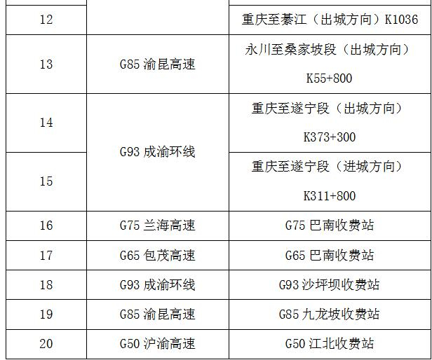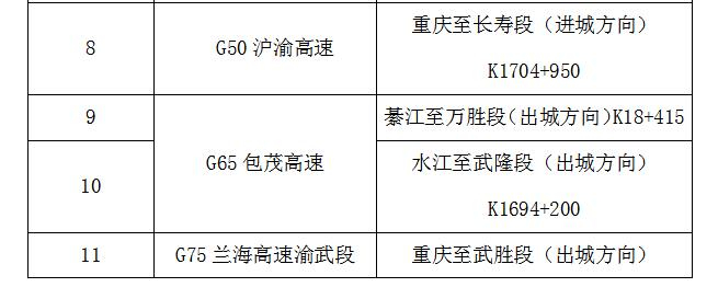 其中,查处违法占用应急车道、随意变更车道违法行为主要集中在G85成渝高速、G93渝遂高速、G50沪渝高速、G75兰海高速、G50S沪渝高速南线、G65包茂高速等拥堵路段。高速公路倒车主要查处非ETC车辆闯入ETC车道,违反禁令标志的违法行为。同时,将严厉查处车辆在高速公路匝道口倒车及停留观望的违法行为。