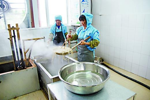 走进加工车间,记者观察到,工人们操作熟练,洗鱼、剖骨、绞肉、和面、擀面、蒸面、定型、切面、晒面等十余道工序井然有序。据美道全食品有限公司总经理陈勇全介绍,为保证极致的口感,传统鱼肉面的生产制作所用的鲜鱼,必须是长寿湖内新鲜、无污染、无变质的青鱼、草鱼或鲢鱼等。