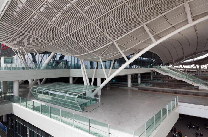 铁四院设计的武汉站首创“桥建合一”的站房形式,将铁路站场、旅客站房和交通广场三者完全立体叠合。铁路和站台以多排并联桥梁的形式架空,桥上建站房、桥下设换乘交通,桥梁与建筑合一,又进一步缩减了旅客进出站和换乘的流线距离。进入武汉站的旅客,可第一时间了解整个车站布局,明确自己所处方位,甚至能看见站台上即将乘坐的高铁列车。对平复旅行焦躁情绪,避免盲目拥挤,提高车站运营效率起到较好效果。