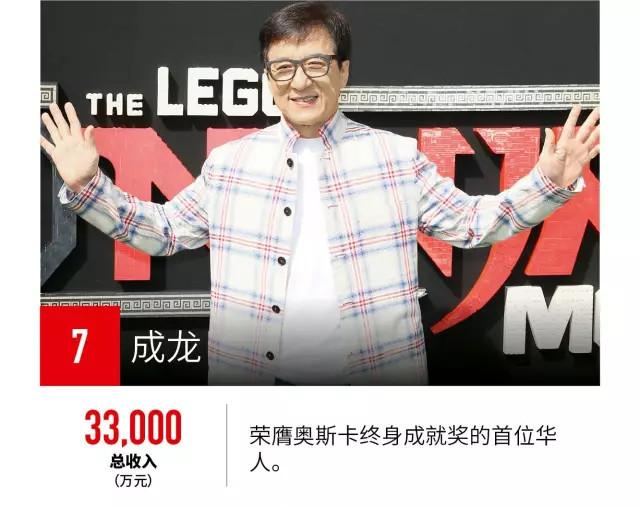被授予奥斯卡终身成就奖小金人的成龙荣登榜单第七位。其主演的《功夫瑜伽》以17.5亿元摘得今年上半年票房冠军。