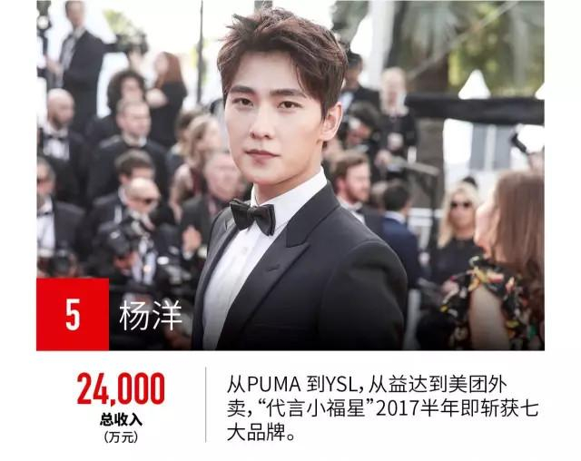 而获封代言“小福星”的杨洋位居榜单第五。从运动品牌PUMA到YSL,从益达到美团外卖,仅2017年半年杨洋即斩获七大品牌。