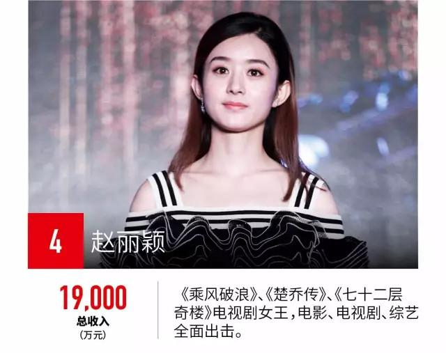 以作品《乘风破浪》、《楚乔传》、《七十二层七楼》全面出击电影、电视剧、综艺市场并兼获好评的赵丽颖升至榜单第四位。