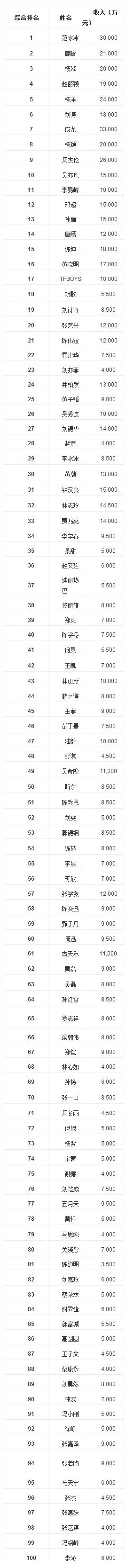 福布斯2017中国名人榜公布,范冰冰蝉联榜首孙杨入围
