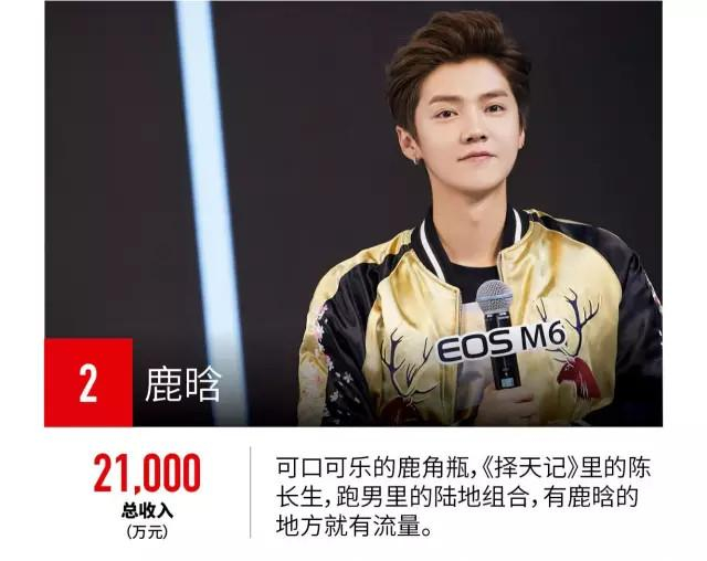 榜眼花落“顶级流量”鹿晗。今年上半年,其四张数字专辑收入超4000万元,获封内地乐坛销量王。古装首秀《择天记》尽管口碑不佳,但其超高人气助该剧收视平稳。《奔跑吧》中与年内最热小花迪丽热巴的陆地组合,吸引眼球、话题不断。