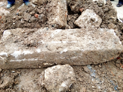知情者介绍,前几天的一个上午,在弘桥路与大庆路交叉口向西80米处,管道工程挖机在地下40厘米深处,挖出一块长5米左右、宽60厘米左右、厚40厘米左右的大条石,当时掀开一块,发现不止一块,下面有水。有关人员随即报告有关部门,隔了几天,该处施工又挖开吊出3块大石,均已进行回填。散落在外面的是碎石块。