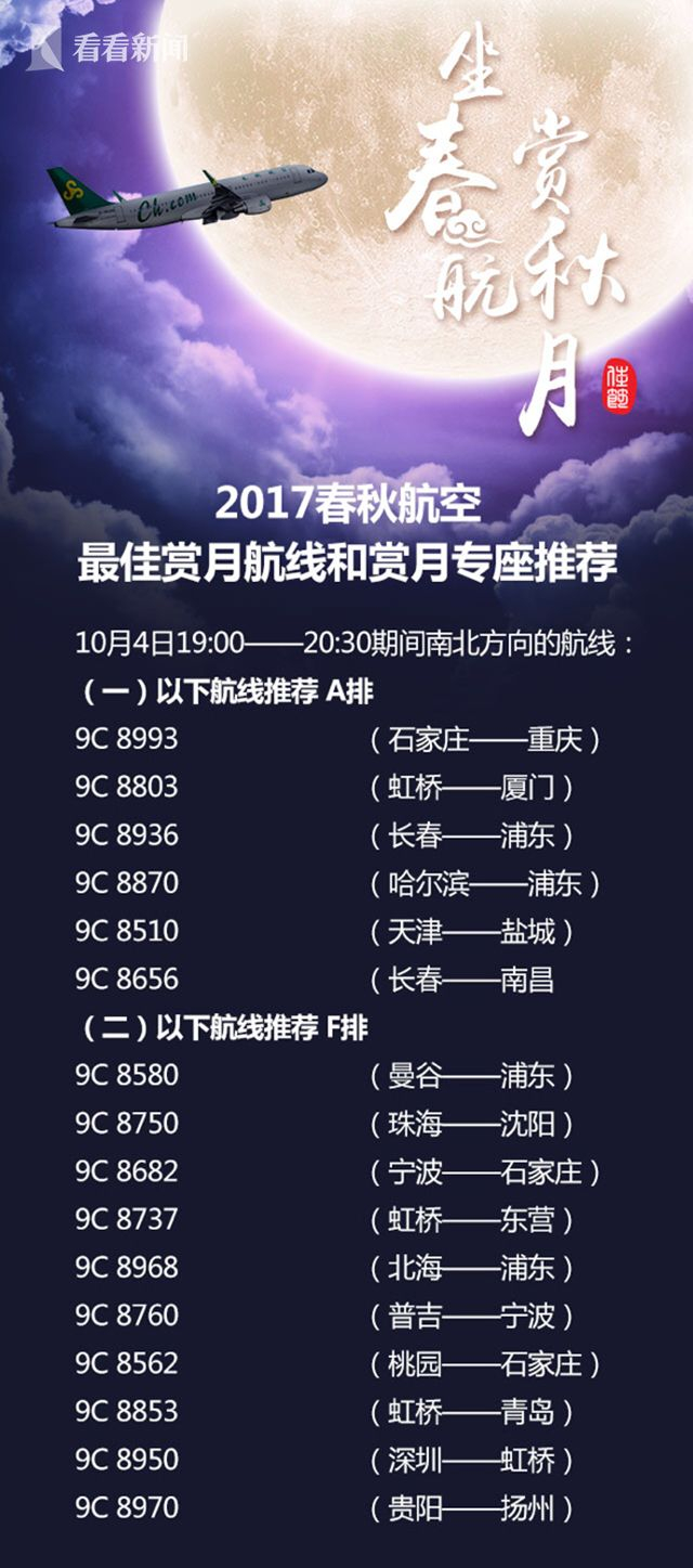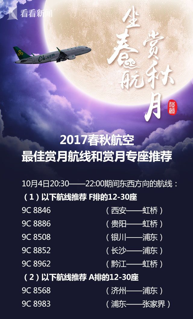 春秋航空相关负责人表示,今年凡准备购买春秋航空中秋赏月航班的旅客,依旧可以登录春秋航空官方微信,通过“微选座”产品,提前选择百余条国内航线的“赏月专座”。