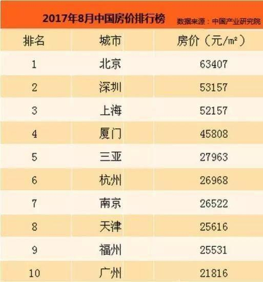 中国产业研究院的平均房价数据显示,北京、深圳和上海的平均房价超过5万,其次是厦门4.5万,杭州、南京、天津、福州的房价在2.5万到2.8万之间,广州由于城市周边房子供应多,总平均价2.2万左右。