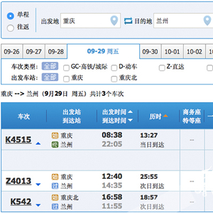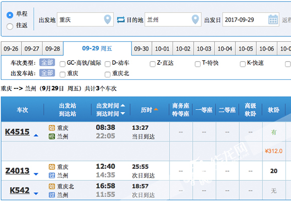 华龙网9月26日18时10分讯(首席记者 徐焱) 今(26)日下午,记者登陆中国铁路客户服务中心12306官方网站查询发现,网上已经开始售29日的兰渝铁路车票了,重庆到兰州的K4515次列车早上8:38正式运营,兰州到重庆的K4518次列车则在9:09发车,这也标志着本月29日,兰渝铁路将通行普速客车。