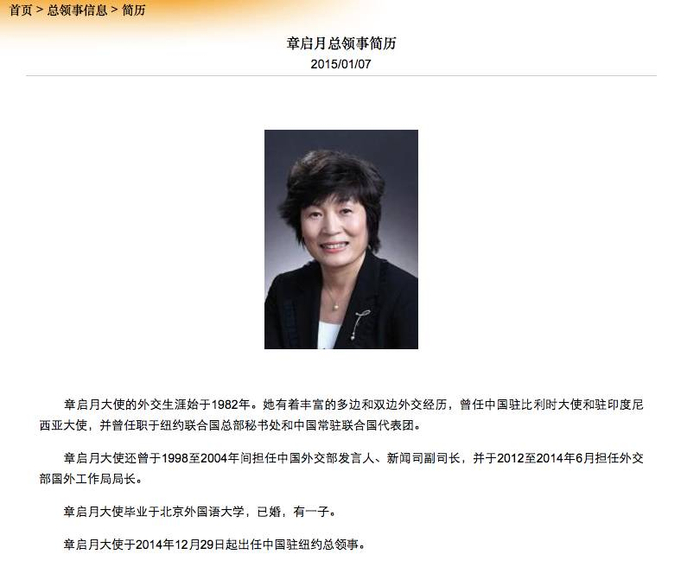 2014年12月29日,刘结一在纽约履职一年半后,中国新任驻纽约总领事章启月抵达纽约履新,成为历史上首位中国驻纽约女总领事。