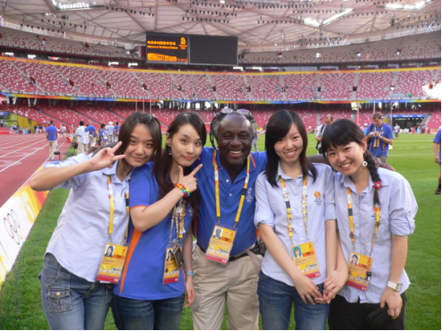 2008年在鸟巢,与来自香港、非洲、韩国的志愿者一起参与奥运志愿服务