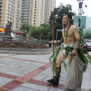 李小姐介绍说,这名野人男子全身半裸,身披粽叶,脖子戴者一串珠子,手拿竹棍和麻袋,整个上半身涂鸦成豹子似的花纹,看着十分喜感。