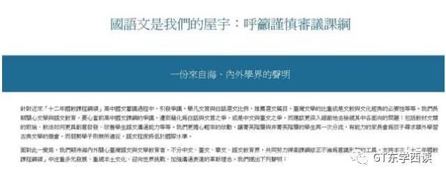 “国语文是我们的屋宇!”对于台当局的这一举动,台湾各界人士举行了数万人参与的联署活动,呼吁高中国文课纲保留更多的文言文。正如台湾竞争力论坛执行长谢明辉所说,“时代在变、环境在变、潮流在变,但不该变的是百年树人的根基。”