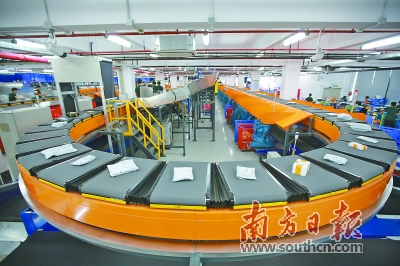东莞国际邮件互换局兼交换站首次使用智能机器人传输邮件,目前日均处理能力最高可达80万件。南方日报记者 孙俊杰 摄