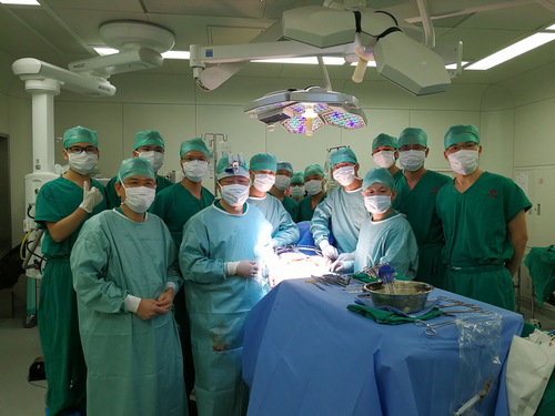 第一台“不中断血流”肝移植手术结束后,何晓顺团队在手术台旁合影。