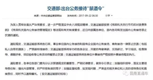 9月22日,中纪委官网发文表示,交通部近日已向部属各单位、部内各司局发出国内公务接待禁止饮酒的通知。