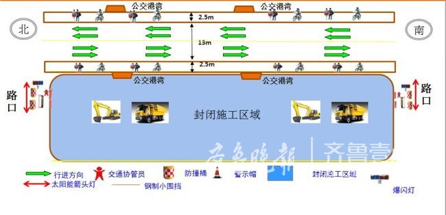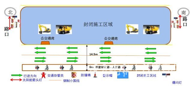 由于凤岐路只有2路公交车(146和161路),且车辆较少,可以在社会交通机动车便道上正常行驶,公交交通线路不变,站点位置利用围档设置港湾,保证候车人员安全。