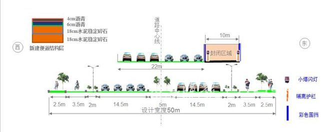 2.2第二施工阶段:西半幅施工(工期2017.10-2018.3):主要施工西半幅综合管廊、燃气、电信、交通设施和道路结构层。封闭现状路面,将东侧绿化带硬化的14米路面,分为双向机动车道和双向非机动车道(3m+4m+4m+3m) 。