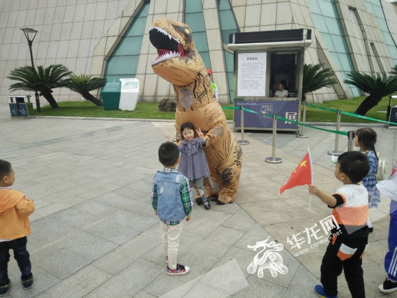 小朋友争先和小恐龙合照。 记者 王媛 摄