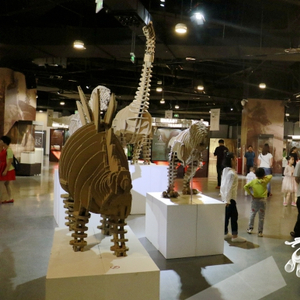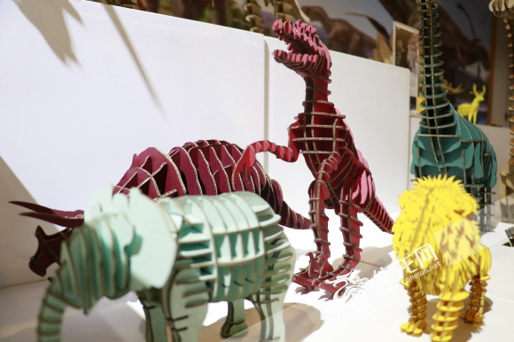 走进展厅,4只恐龙拼插模型可以瞬间吸引住你的眼球。恐龙模型的材质采用的是能够体现环保理念的本色瓦楞纸,其中腕龙模型还借助机电装置“复活”了。隔几分钟,它就会摆动头部,发出吼叫,一副傲视群雄、高高在上的模样。再往展厅里走,会不时碰见多只不同种类的形态各异的恐龙拼插模型,这给我们的恐龙探索之旅带来了不小的新奇和愉悦。