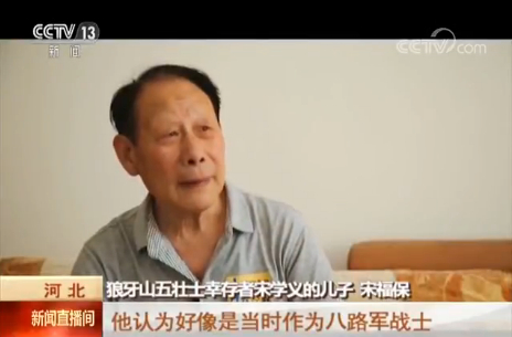 狼牙山五壮士幸存者宋学义的儿子 宋福保(66岁):后来我父亲回忆这个事情,他没有认为这个事情做得多崇高、多伟大,他没有这样想,他认为好像是作为八路军战士,这些事情做得是本分的事,都应该的,作为一个八路军战士,作为一个中国人,他们当时提的口号一个是不当亡国奴,再一个是决不当俘虏,不能让鬼子抓去,不当俘虏。