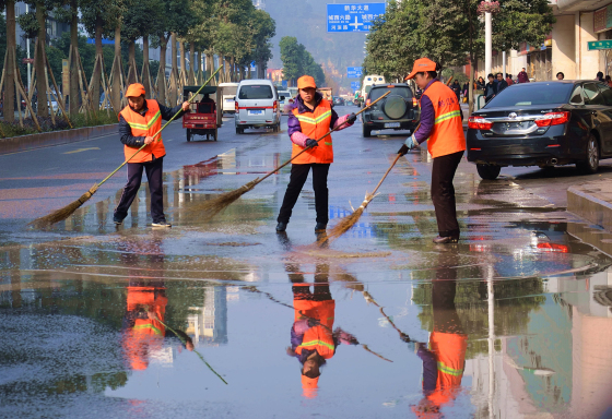 市政工作人员清扫道路。通讯员 孙华 供图在新华大道中段,笔者看到,平时上班时间匆匆忙忙来往的人群已经不见,路段显得冷清寂静。但依然有一处热闹的景象,显得与周围格格不入。他们是市政的工作人员,正挥舞着扫帚在河堤沿线忙碌着,为城市干净整洁奔走着,成为此时这个显得冷清单调的小城里最美的一道风景。