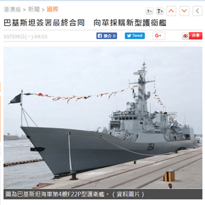 [环球网报道 记者 查希]香港东网10月9日报道称,巴基斯坦向中国采购新型护卫舰一事,首次传出确切消息。