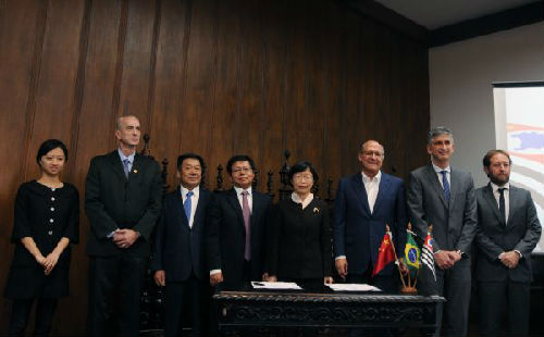 9月1日,在巴西城市圣保罗,圣保罗州州长阿尔克明(右三)、中国驻圣保罗总领事陈佩洁(右四)和中国中车副总裁楼齐良(左四)等人出席城轨车辆供货合同签约仪式。中国中车青岛四方机车车辆股份有限公司与巴西圣保罗城际铁路公司1日签署8列共64辆城轨车辆供货合同,合同金额超过1亿美元。(新华社)