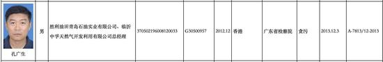 孔广生,男,原任胜利油田青岛石油实业有限公司总经理兼临沂中孚天然气开发利用有限公司总经理,涉嫌贪污罪,2012年逃往香港。国际刑警组织红色通缉令号码A-7813/12-2013。