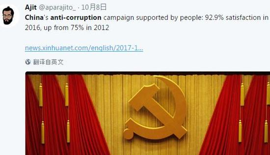 而在推特上,网友Ajit转发了有关中国反腐行动的文章,并援引了中国国家统计局的问卷调查结果称,中国群众对反腐败工作成效表示很满意或比较满意的比例已经由2012年的75%增长至2016年的92.9%。(海外网 张霓)