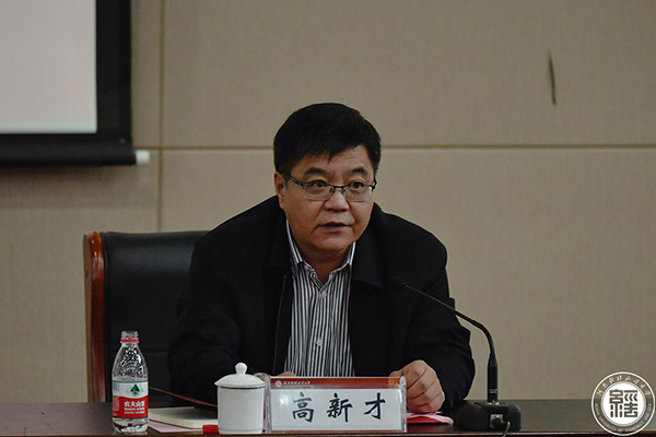 高新才在讲话中衷心感谢教育部党组,河南省委省政府及河南财经政法大学广大师生员工的信任和支持。他表示要时刻牢记组织重托,师生期待,尽快熟悉河南财经政法大学的基本情况,问计于师生,问需于师生,以饱满的工作热情投入工作。着力增强四个意识,坚决向以习近平为核心的党中央看齐,把党的教育方针、中央决策部署与河南省委省政府要求落实到办学治校的各个环节中。认真自觉对照党的政治纪律和政治规矩,筑牢防腐倡廉的思想道德底线。贯彻执行好党委领导下的校长负责制,牢固树立进取意识,机遇意识,责任意识,与全体班子成员一道,团结广大师生员工,全力以赴,共同为开创学校发展新局面,谱写学校发展新篇章而努力奋斗。