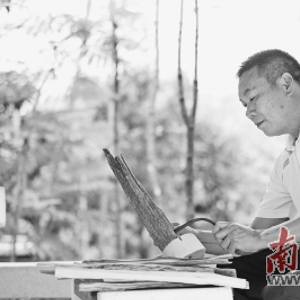 对于如何结香,林绍德一直在学习和探索。从原来对结香技术一无所知,到请教行家边做边学,再到如今基本可独立护理香林,短短几年间,林绍德已成为了一名“资深”的香农。在人工结香技术出现前,他模仿自然环境下的结香条件,促使沉香树结香。“在树干上砍伤一部分,再涂蜂蜜或白糖水,让蚂蚁等昆虫咬食,综合作用下,树的伤疤就会慢慢成香。”但林绍德发现,用这种“土”办法,结香耗时长,且成功率不高。