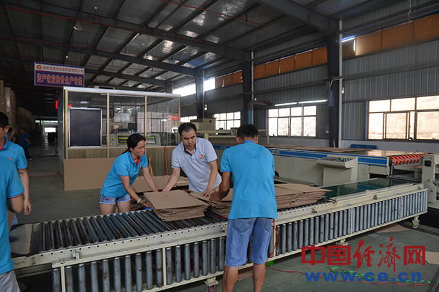 图为湖南百捷利包装印刷有限公司的员工在生产流水线上