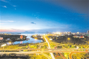 经过景观亮化工程等工作,如今的滨海立交桥景色迷人,让夜幕下的海口更显靓丽。