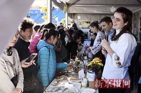 在现场,各国使馆展台上的特色物品琳琅满目,南非的博士茶、芬兰的帽子、朝鲜的泡菜、俄罗斯的民族工艺品……应有尽有。一些展台为吸引游客,穿着本民族的服饰进行即兴表演。许多展台为方便游客付款,贴出来微信和支付宝的二维码。