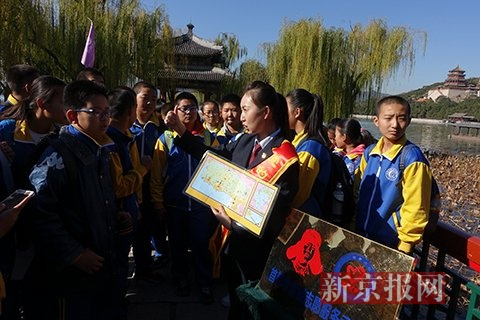 颐和园“韩笑工作站”内,讲解员韩笑正在向游览学生介绍颐和园。新京报记者 侯少卿 摄