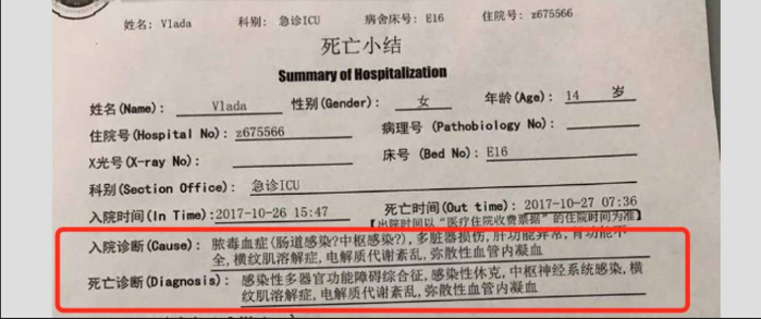 环环(ID:huanqiu-com)得到的一份Vlada就诊医院出具的死亡证明,关于死亡诊断为: