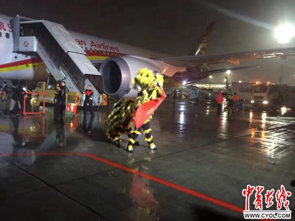 谢列梅捷沃国际机场停机坪海航787首飞前现场舞狮表演。张健 摄