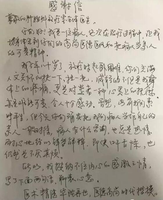 八旬老人亲笔书写感谢信赞医生