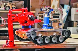 ●武装排障履带车,这是一架带火箭声的发射器,前面装有开源Uarm机械手,后面是原创设计的云台发射器。