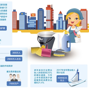 “多年来全行业营业收入持续保持20%的增长速度,今年上半年居民用于家政服务的消费支出增长21.4%,2017年全年营业收入预计达到4000亿元以上。”国家发改委社会司副司长郝福庆说,这还是在行业存在“小、散、乱”等问题情况下取得的成绩,只要加以规范引导,家政行业劳动生产率必将大幅提高。