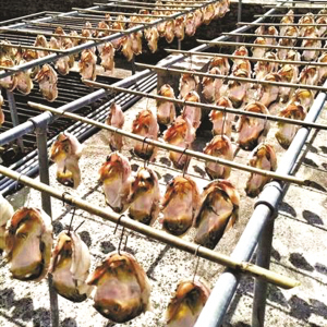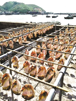 “兴丰干货”的销售人员还向北青报记者展示了河豚鱼干制作和晾晒的图片,图片中上百条被宰杀处理过的河豚,五条一排挂在海边的一排架子上进行晾晒。当北青报记者问到是哪种河豚时,店家表示是“野生的没有毒的”,但是北青报记者继续追问河豚具体种类时,店家表示“不太清楚”,只知道统称为“河豚”,当地方言叫“乖脯”。