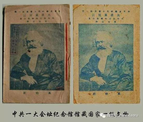 这批文件中,还有一件珍贵的文物——《共产党宣言》。1920年4月下旬,陈望道将《宣言》译成。同年8月,《共产党宣言》中文全译本终于在上海面世,首印1000册,封面印有水红色马克思微侧半身肖像,很快售罄。9月再版,加印1000册,马克思肖像的底色变成蓝色。