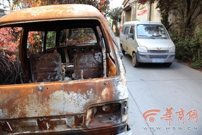 该小区大门要从文景路拐到一条宽约5米、长约200米的路上。道路一侧停放着多辆私家车,其中不乏‘僵尸车’。华商报记者粗略数了一遍,至少有60辆,有的车上铺满了落叶,有的车盖着厚厚的灰尘,还有的车已被烧成架子,仍停放在路边。