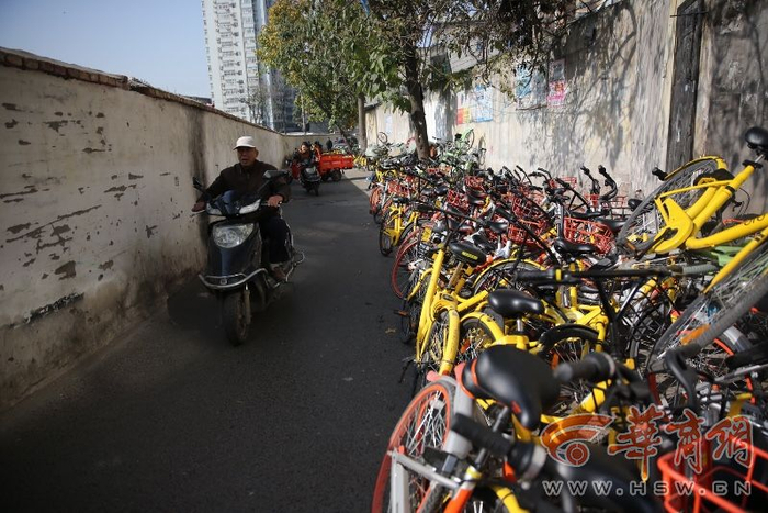 上午10时许,华商报记者在该小区附近看到,宽度近5米的巷子,沿路停放的私家车,多辆被随意停放在路边的共享单车,还有一些大麻袋装的垃圾堆在路边,拐弯处道路宽度甚至不足3米。