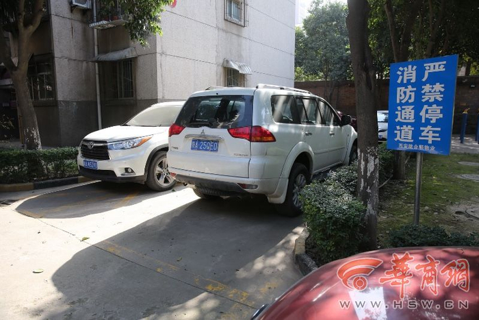 华商报记者看到,该小区内划着停车位,路边还竖着‘消防通道禁止停车’的牌子,但即使白天,小区80%的车位上都停放着车辆。1辆车停到了违停车位上并和一旁车位上的车将消防通道堵死。